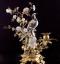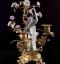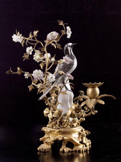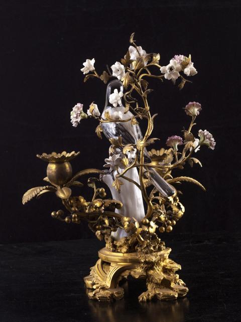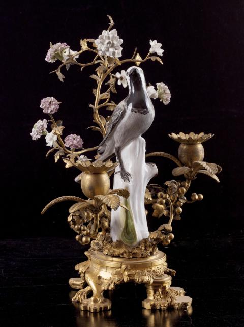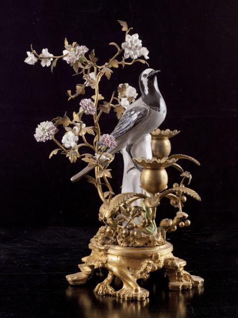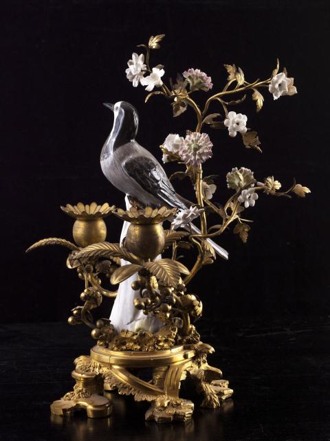 Ces candélabres représentent deux bergeronnettes affrontées sur un tronc entourées de branches de bronze, garnies de fleurs de porcelaine. Œillets et anémones accompagnent les deux volatiles à l’affût. Le rendu virtuose des boutons de fleurs est très naturaliste. Ces objets sont représentatifs des montages réalisés par les marchands merciers parisiens du XVIIIe siècle qui, à défaut de fabriquer, « enjolivaient » les objets. Les garnitures de porcelaine sont montées sur un socle de bronze chantourné typique des années 1750. Ces flambeaux, chacun doté de deux bobèches à motif floral, étaient autant usuels que décoratifs. Il est aisé de les imaginer, telles des évocations d’un perpétuel printemps, dans des intérieurs lambrissés à l’esthétique rocaille. La porcelaine et la gamme chromatique de tons roses et blancs apportent douceur et élégance à ces candélabres. Créée par Auguste Le Fort, la manufacture de Meissen fut la première manufacture de porcelaine en Europe, après la découverte par le chimiste Frédéric Bottger en 1709 de ses principes de fabrication grâce à l'indispensable kaolin. La manufacture fabrique dans les années 1770, les "Deutsche Blumen", fleurs et animaux d'un rendu naturaliste. Sous l'influence de Kändler qui officiera de 1731 à 1763, sa production se peuple d’objets de style rocaille, des statuettes de scènes de la vie quotidienne ou des personnages de la commedia dell'arte, ou encore les figurines de Saxe dont le musée possède plusieurs exemplaires.