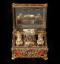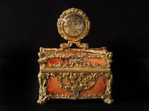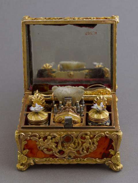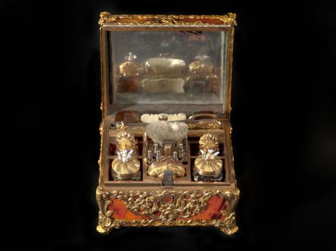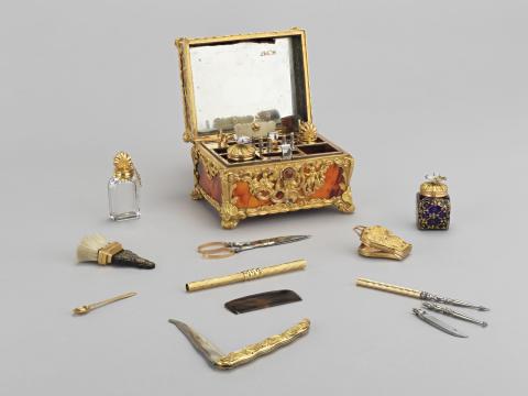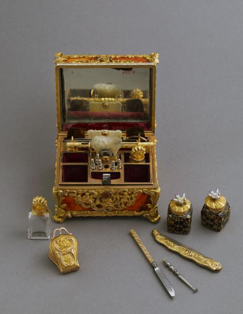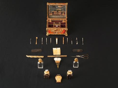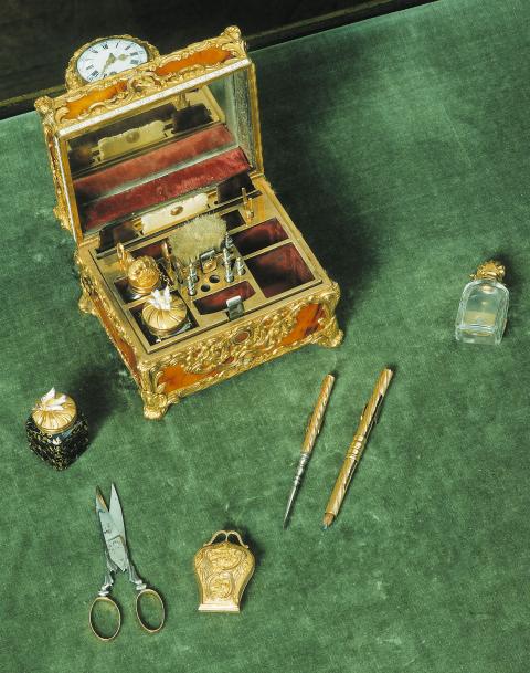 La signature du cadran de la montre "Granthom London" confirme l'attribution de ce nécessaire aux ateliers anglais dont les plus célèbres furent ceux de James Cox. D’origine étrangère, l'inscription « Si en m'ouvrant, Votre pensée s'amuse jusqu'à moi, je jure sur ma foi, Je serai bien récompensée » suggère, en français un cadeau sentimental. L'ouverture de ce coffret révèle une merveille d'ingéniosité. Les usages de ces objets varient, mais ils ressortissent tous des us et coutumes d’un quotidien raffiné. Ils servent à la toilette féminine (boîte à mouches ou à rouge, coffret à parfum, étui porte-lacet..), à la pratique d’occupations privilégiées de l’élite, comme l’écriture (nécessaire à écrire, étui à cire pour cacheter les lettres...) ou encore aux nouveaux plaisirs de bouche. En effet, ce ne sont pas moins de 19 petits instruments qui sont logés dans des compartiments faits aux dimensions de chacun d'entre eux : flacons dont le bouchon adopte tantôt la forme d'une coquille en or tantôt celle d'un oiseau en porcelaine polychrome de Chelsea, tablettes à écrire en ivoire avec leur crayon, grattoir et coupe-papiers, objets de toilette divers (peignes, brosse, passe-lacets, repousse-peau...). Trop petits pour être bien tenus en main, ceux-ci venaient se visser sur un petit manche en or torsadé.