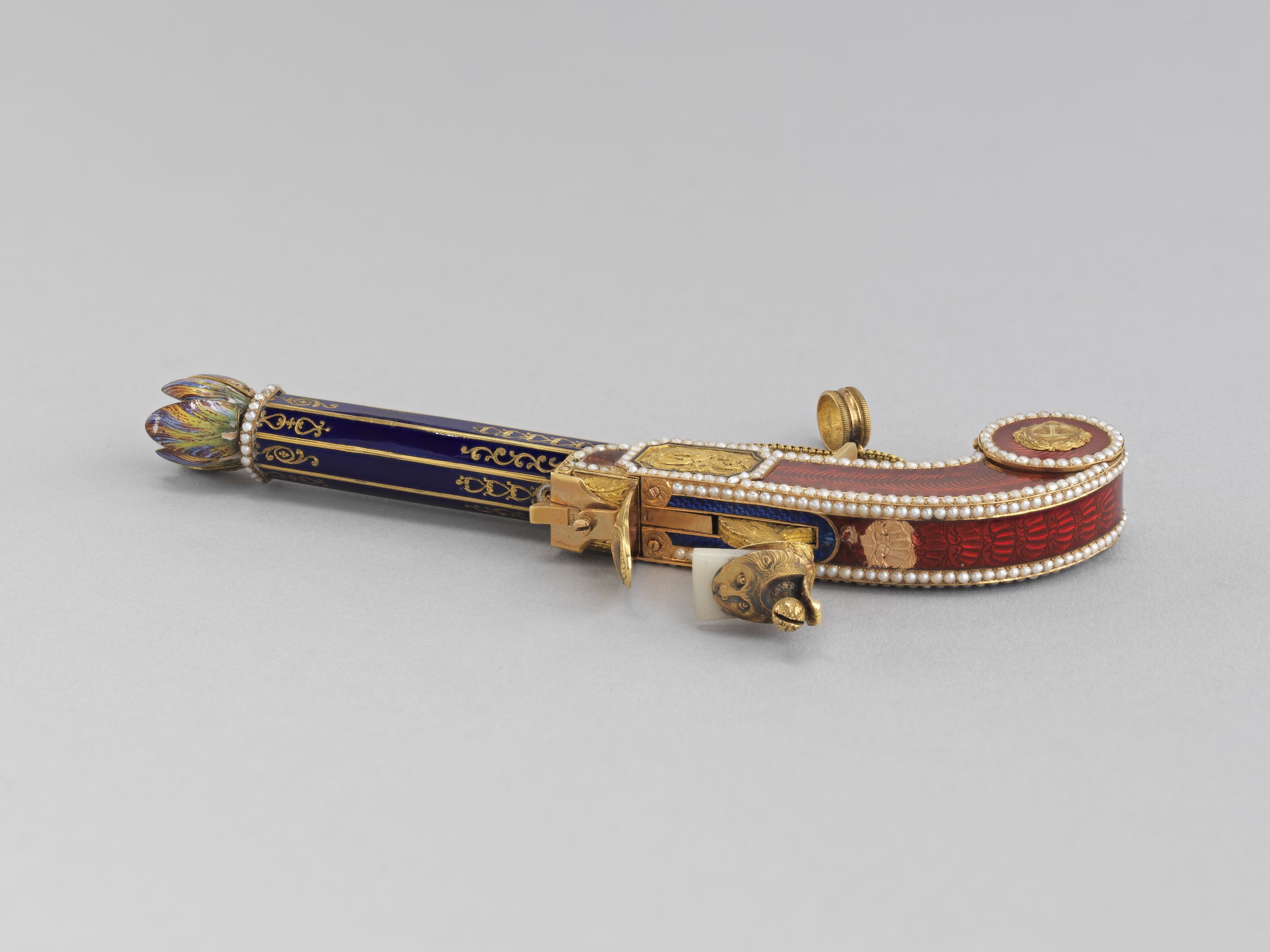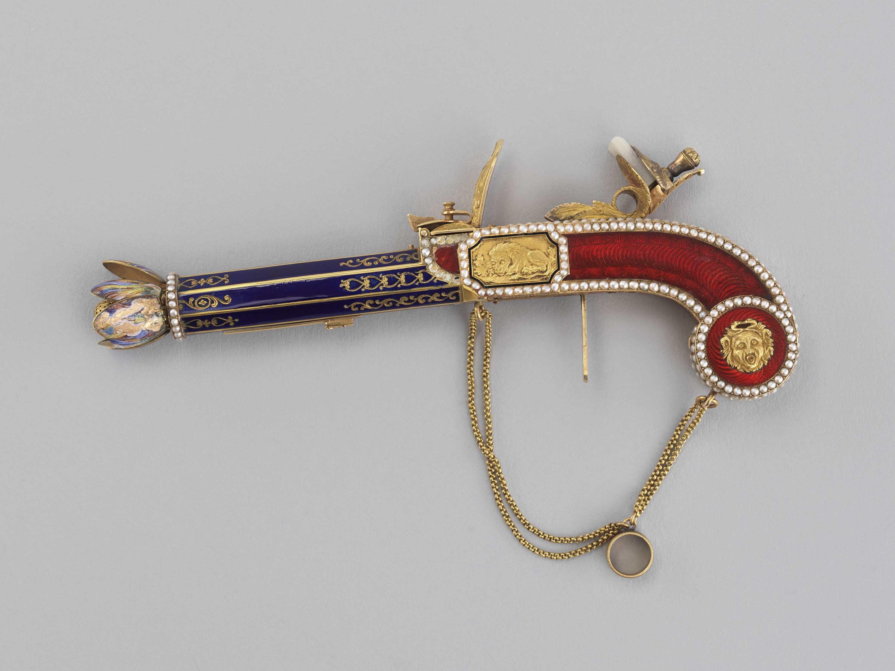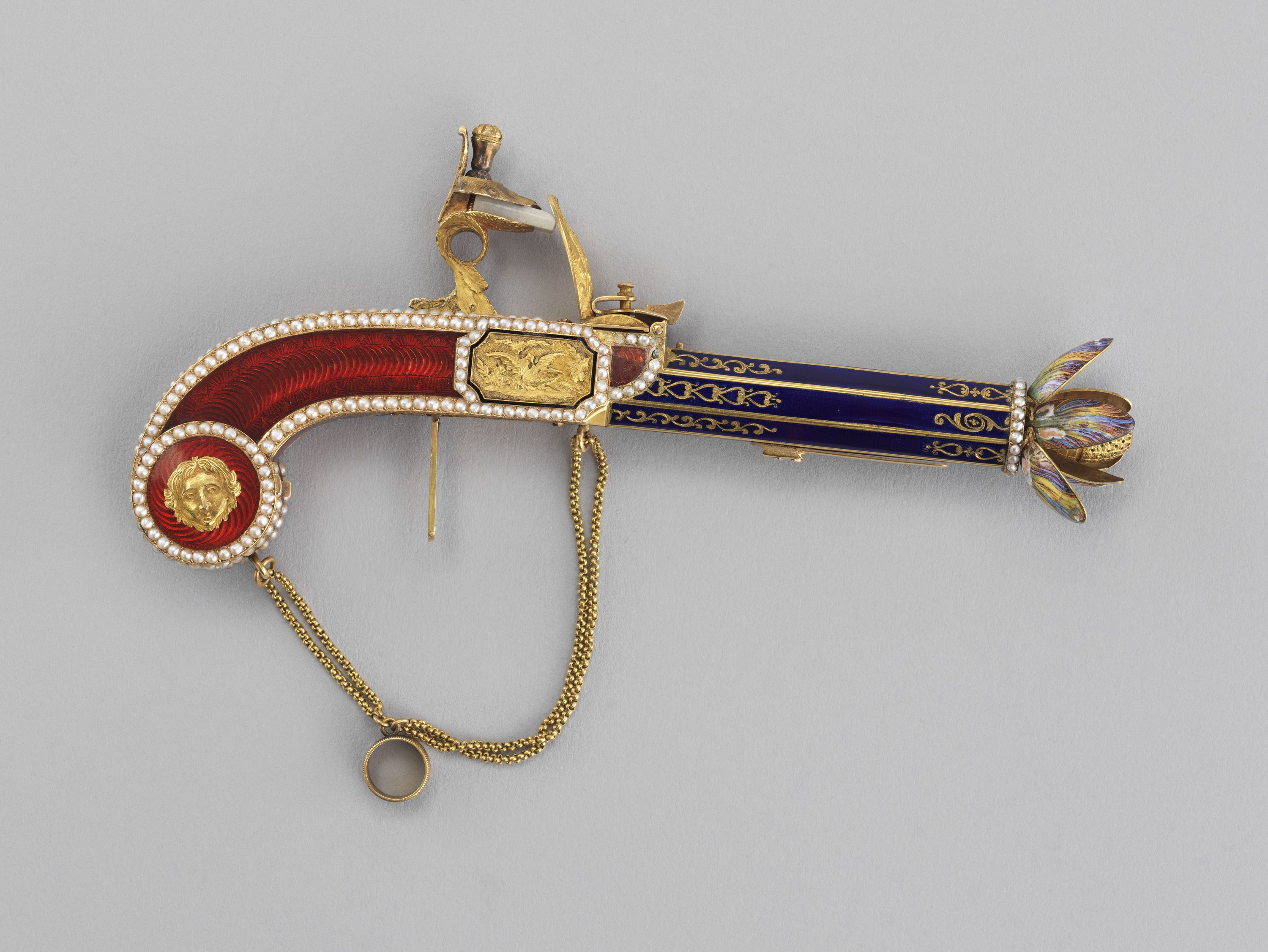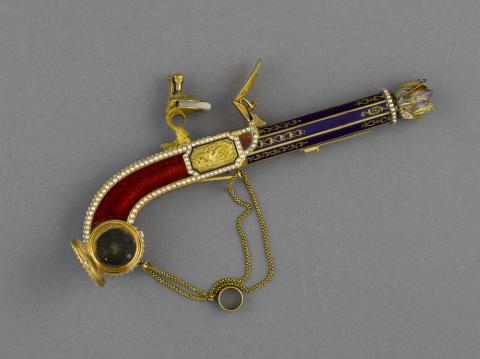 Par l'élégance de sa forme et son ingéniosité, ce pistolet en or émaillé de bleu et de rouge, enrichi de perles fines, se distingue parmi la riche collection de 260 objets précieux du musée. Le bouton du canon s'épanouit en une corolle de pétales, qui révèle le cœur de la fleur en or percé de manière à distiller les senteurs. Le petit médaillon orné d'un masque est monté sur charnière et s'ouvre sur un compartiment. Sur d'autres exemplaires, ce compartiment abrite une montre. La technique de l'émaillage translucide sur or guilloché et la qualité de la ciselure illustrent l'excellence des artisans de la fin de l'Ancien régime et le goût raffiné de leur clientèle. À la fin du XVIIIe siècle, les artistes rivalisèrent de fantaisie et imaginèrent toutes sortes de formes nouvelles et surprenantes dans lesquelles cacher nécessaires, montres et flacons. De tels étuis contenaient les parfums ou les sels dont les dames faisaient grand usage.