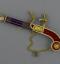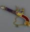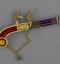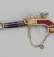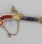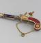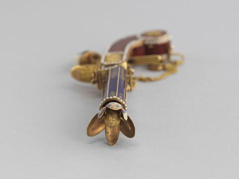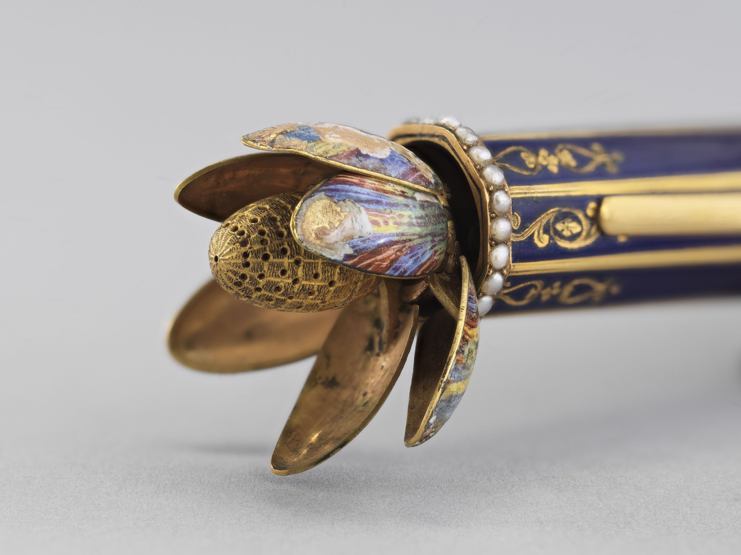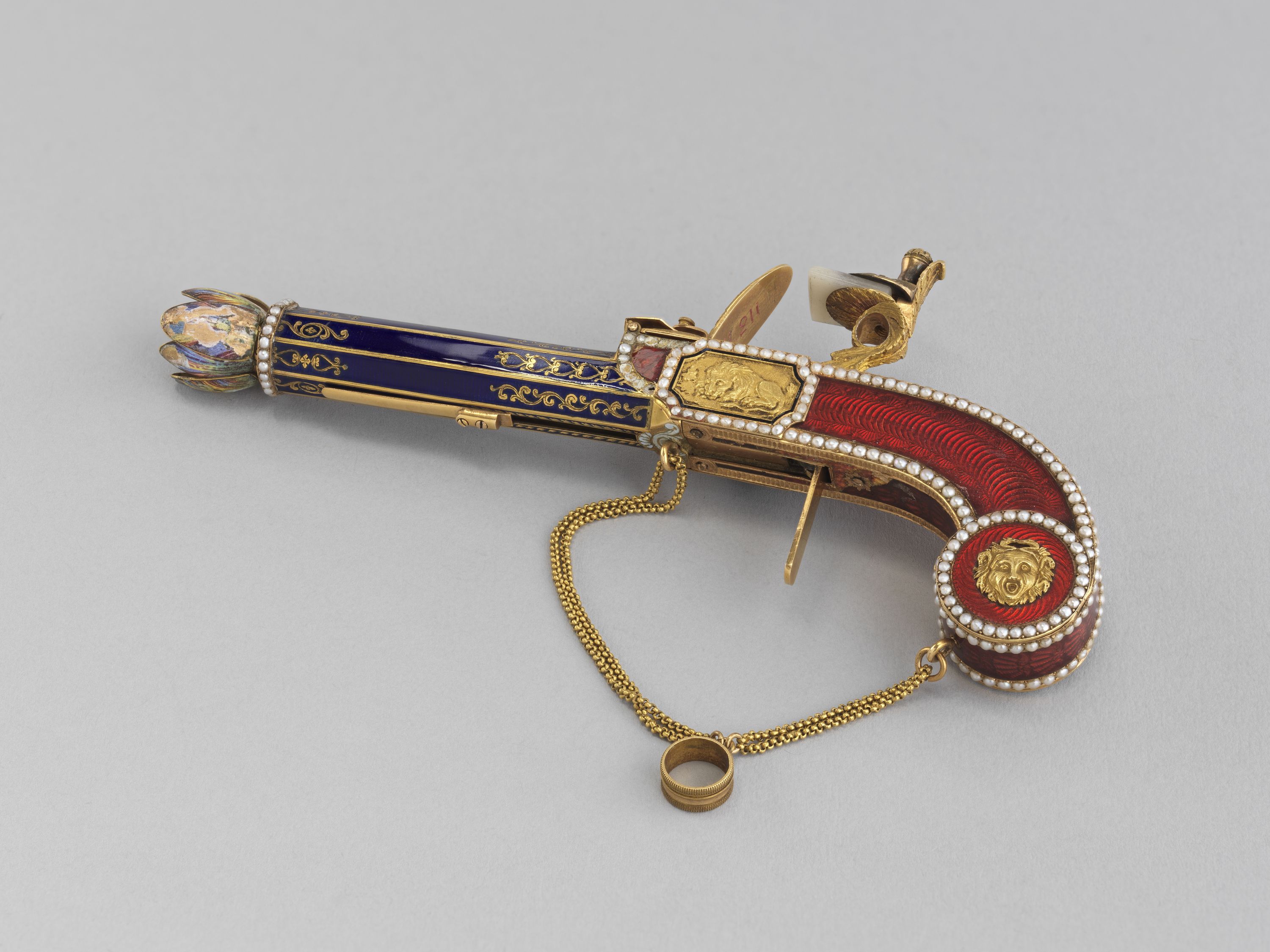 Par l'élégance de sa forme et son ingéniosité, ce pistolet en or émaillé de bleu et de rouge, enrichi de perles fines, se distingue parmi la riche collection de 260 objets précieux du musée. Le bouton du canon s'épanouit en une corolle de pétales, qui révèle le cœur de la fleur en or percé de manière à distiller les senteurs. Le petit médaillon orné d'un masque est monté sur charnière et s'ouvre sur un compartiment. Sur d'autres exemplaires, ce compartiment abrite une montre. La technique de l'émaillage translucide sur or guilloché et la qualité de la ciselure illustrent l'excellence des artisans de la fin de l'Ancien régime et le goût raffiné de leur clientèle. À la fin du XVIIIe siècle, les artistes rivalisèrent de fantaisie et imaginèrent toutes sortes de formes nouvelles et surprenantes dans lesquelles cacher nécessaires, montres et flacons. De tels étuis contenaient les parfums ou les sels dont les dames faisaient grand usage.