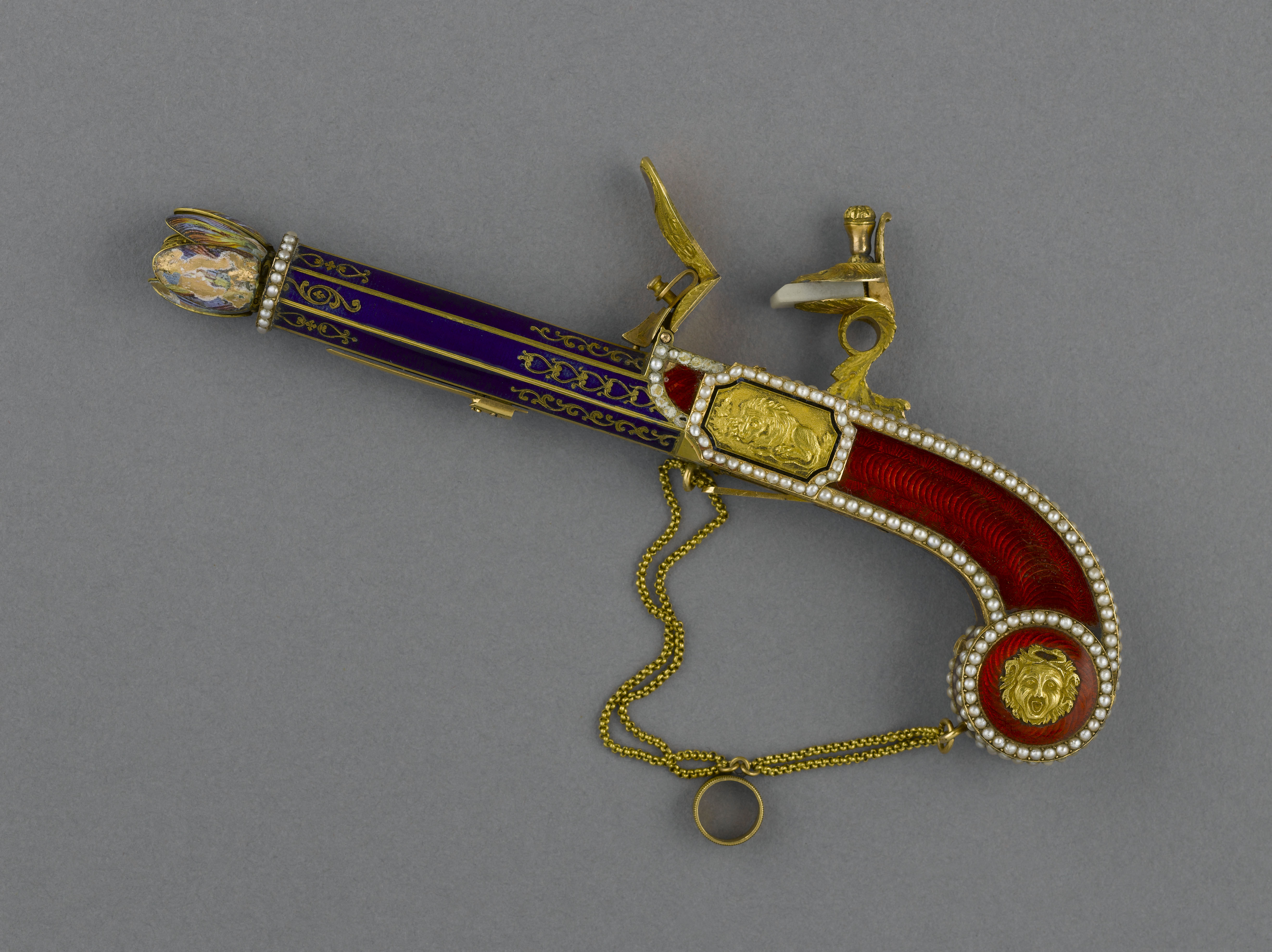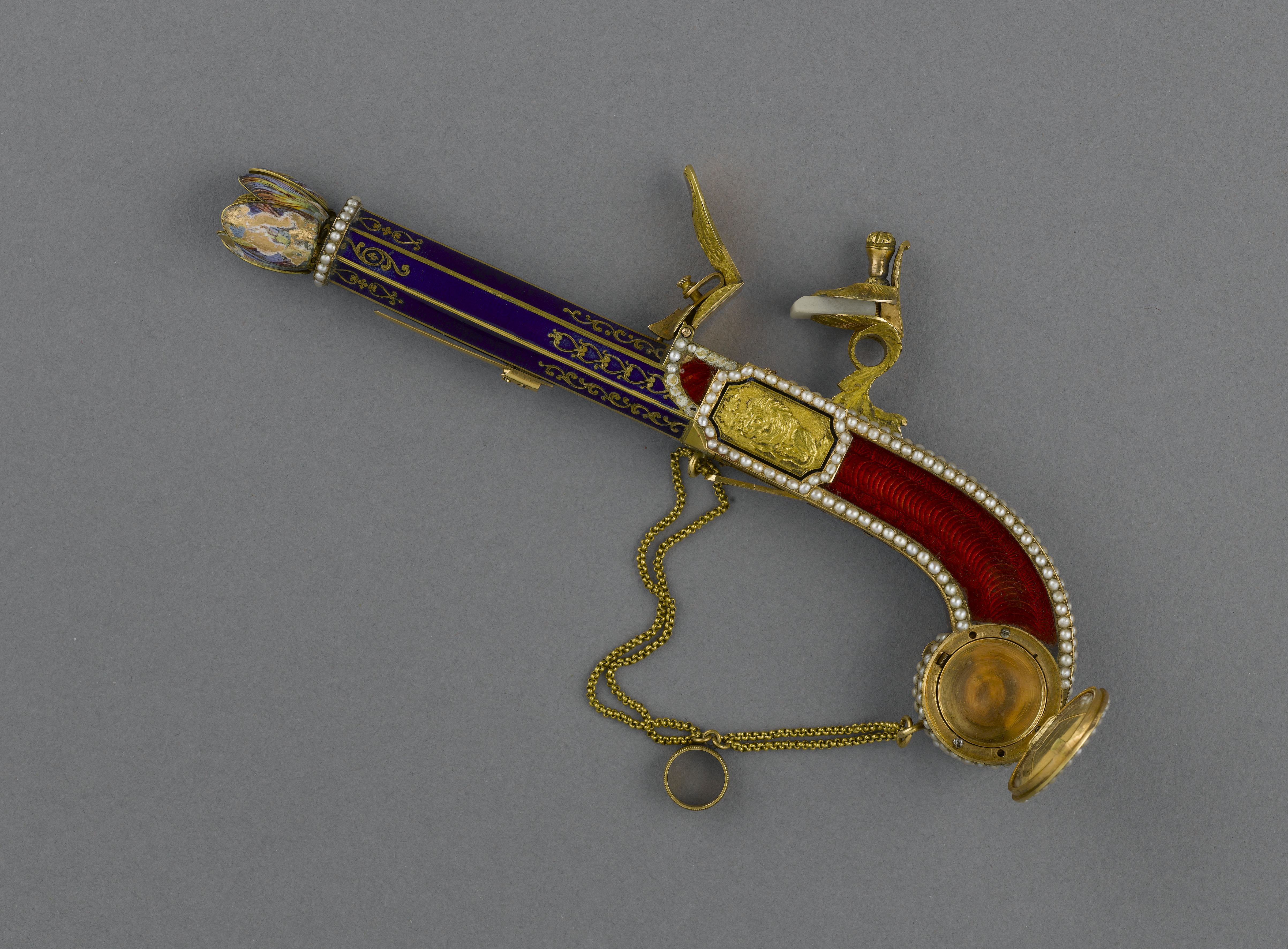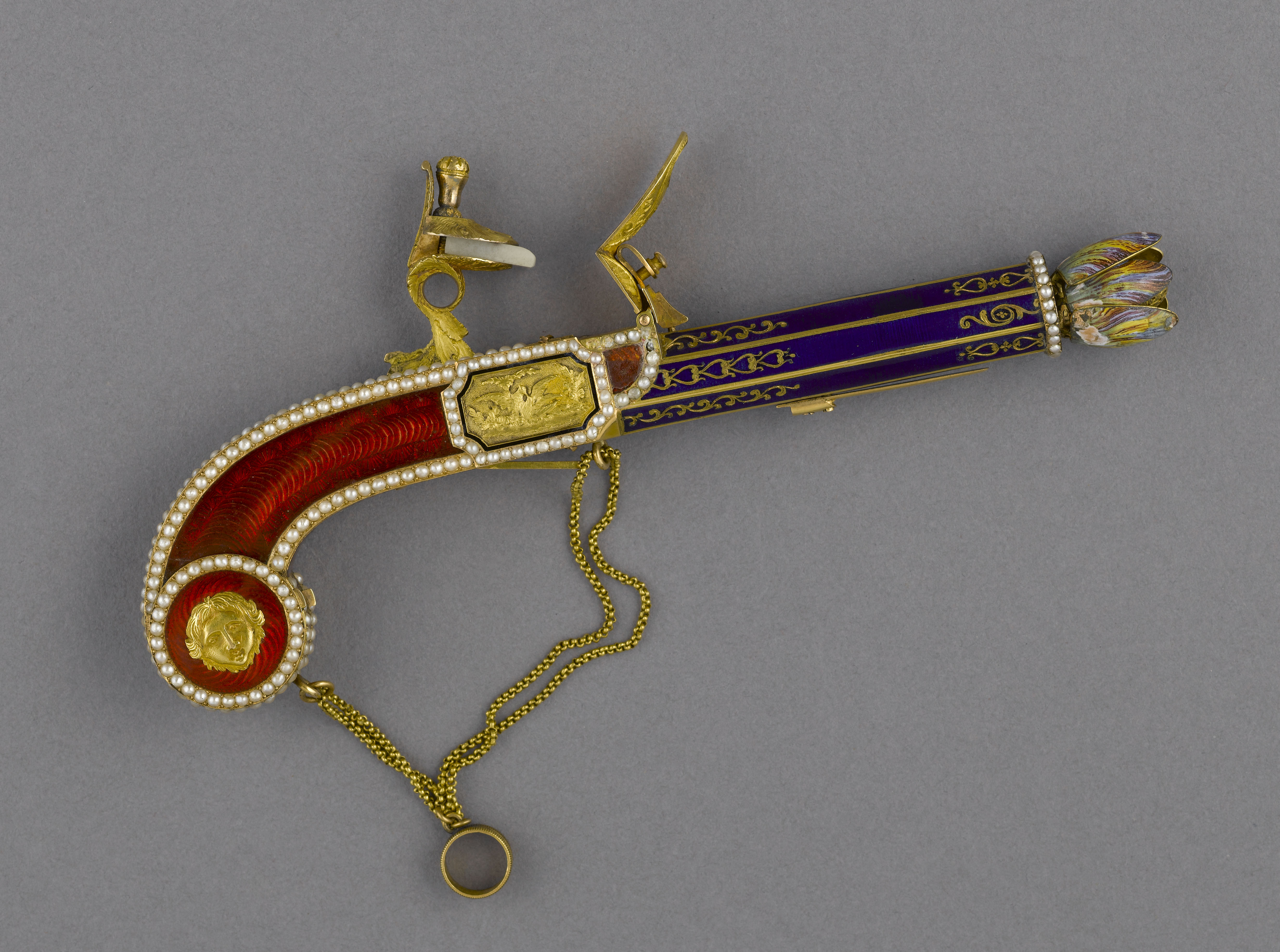 Par l'élégance de sa forme et son ingéniosité, ce pistolet en or émaillé de bleu et de rouge, enrichi de perles fines, se distingue parmi la riche collection de 260 objets précieux du musée. Le bouton du canon s'épanouit en une corolle de pétales, qui révèle le cœur de la fleur en or percé de manière à distiller les senteurs. Le petit médaillon orné d'un masque est monté sur charnière et s'ouvre sur un compartiment. Sur d'autres exemplaires, ce compartiment abrite une montre. La technique de l'émaillage translucide sur or guilloché et la qualité de la ciselure illustrent l'excellence des artisans de la fin de l'Ancien régime et le goût raffiné de leur clientèle. À la fin du XVIIIe siècle, les artistes rivalisèrent de fantaisie et imaginèrent toutes sortes de formes nouvelles et surprenantes dans lesquelles cacher nécessaires, montres et flacons. De tels étuis contenaient les parfums ou les sels dont les dames faisaient grand usage.