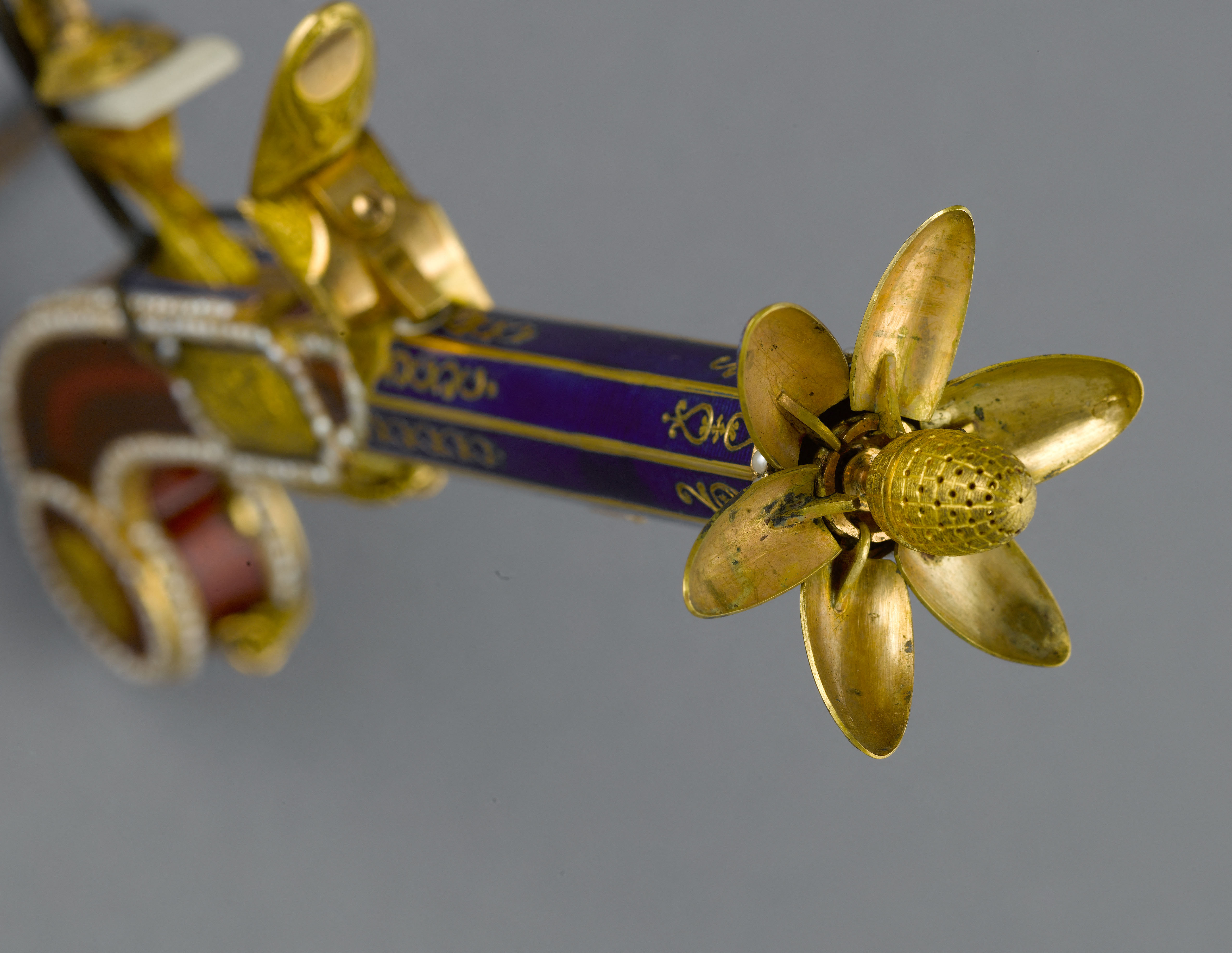 Matériau et technique : Or, Ciselure, Guillochage, Email (technique métal), Perle fine