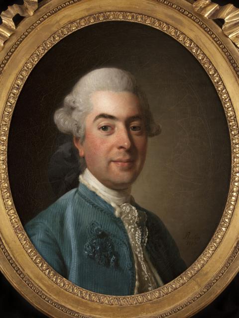 Artiste suédois de renom, installé à Paris depuis 1752, Roslin dépeint ici un homme d’âge mûr, coiffé d’une perruque blanche à catogan, vêtu d’une veste bleu roi agrémentée d’un jabot de dentelle. Le format ovale et le fond laissé uni incitent l’observateur à se focaliser sur les caractéristiques physiques du modèle. Les ombres soulignent les commissures des lèvres et les traits du personnage, tandis que les dégradés de roses de la carnation modèlent subtilement son visage. Malgré une composition classique et sans artifice, le peintre parvient à transmettre la vivacité du regard irisé de son sujet.